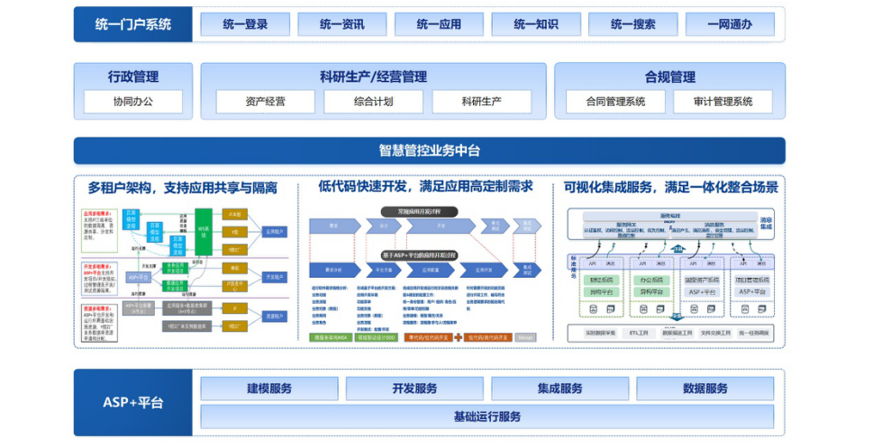 ASP+基礎運行服務:提供了云原生、微服務、組件化、服務化等基礎運行環境和可復用的基礎技術組件、可共享的技術服務,為用戶業務系統建設,從平臺層面實現環境適配能力和全面安全保障能力。